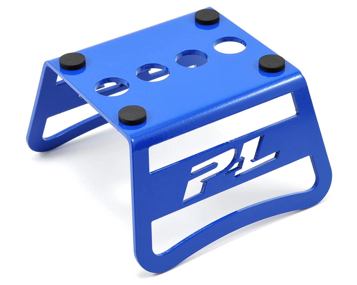 This is the Pro-Line 1/10 Car Stand. Taking its inspiration from popular MX bike stands, this laser cut, and powder-coated blue aluminum Pro-Line car stand is ready to display your car in the best way possible. The stand even has shock building holes in the top for added versatility. Push-in rubber grommets protect your chassis and will prevent your car from sliding around.
