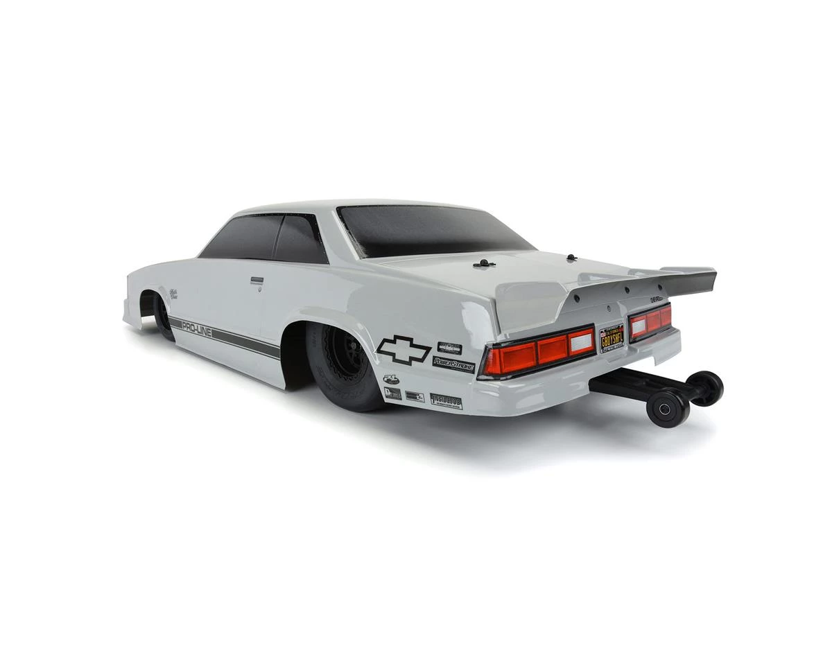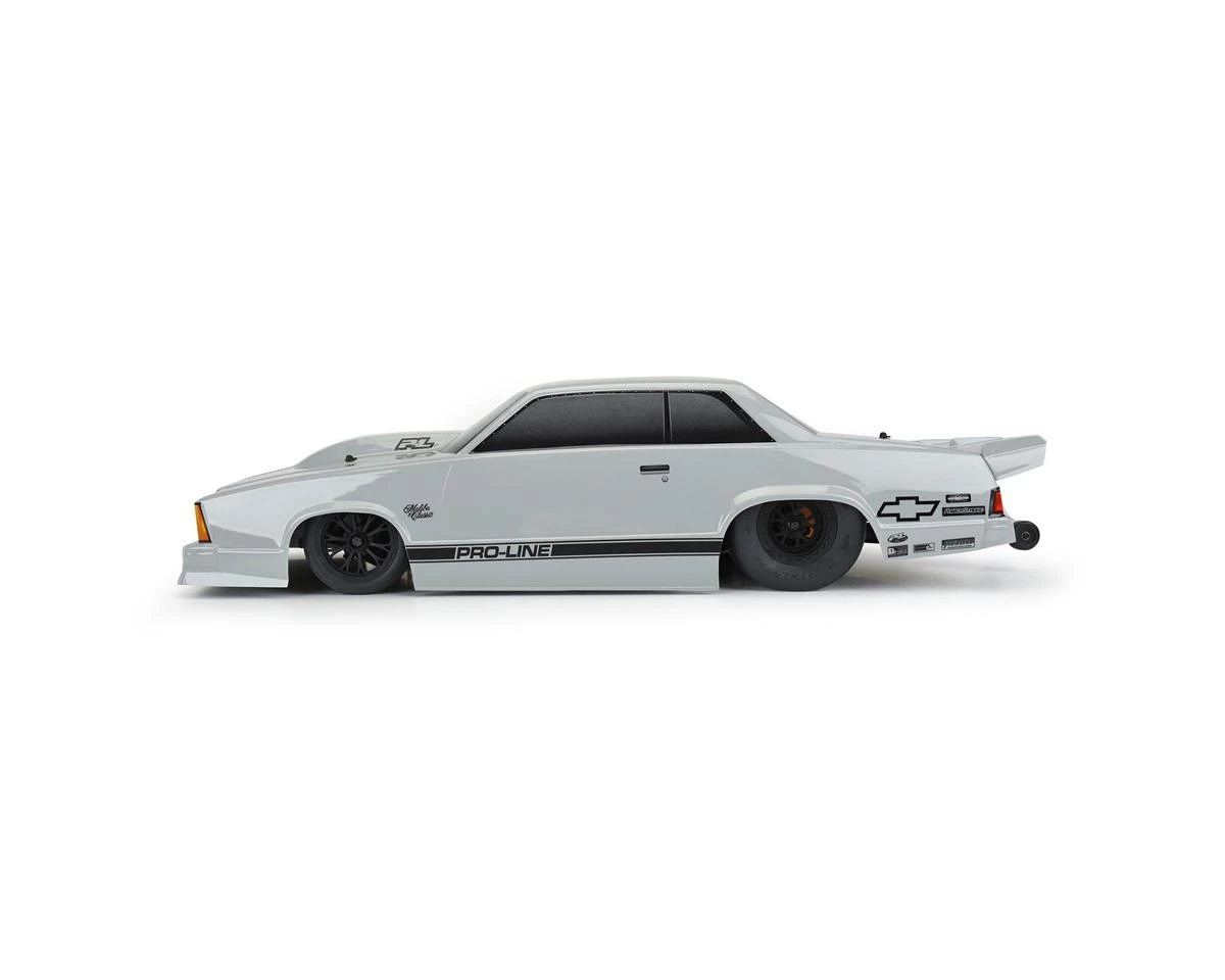 Pro-Line 1978 Chevy Malibu Tough-Color Short Course No Prep Drag Racing Body. Pro-Line has recreated a timeless classis Chevy Malibu body specifically designed for the growing No-Prep SC Drag Racing scene. The Tough-Color polycarbonate is made from gray material so you never have to worry about paint peeling or chipping off. Bowtie fans are sure to love this ultra-scale body that captures the signature details of Mark Micke’s 4,700hp, twin-turbo, 200mph+ G-body Malibu.