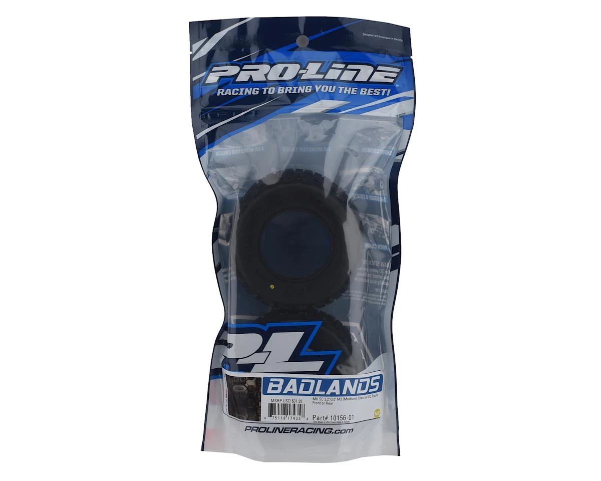 The Badlands MX SC tire uses the latest in motocross tread technology with huge, long-lasting lugs giving it the style and performance that have won over bashers across the globe. The oversized grass and dirt shredding lugs offer you the ultimate in performance under all-terrain type conditions. Compared to the previous Pro-Line Badlands tires, you can expect even better traction, improved wear resistance and enhanced style! Made from Pro-Line’s legendary soft yet durable M2 compound, the Badlands tire is poised for battle and ready to take your Short Course Truck to the next level of bashing heaven.