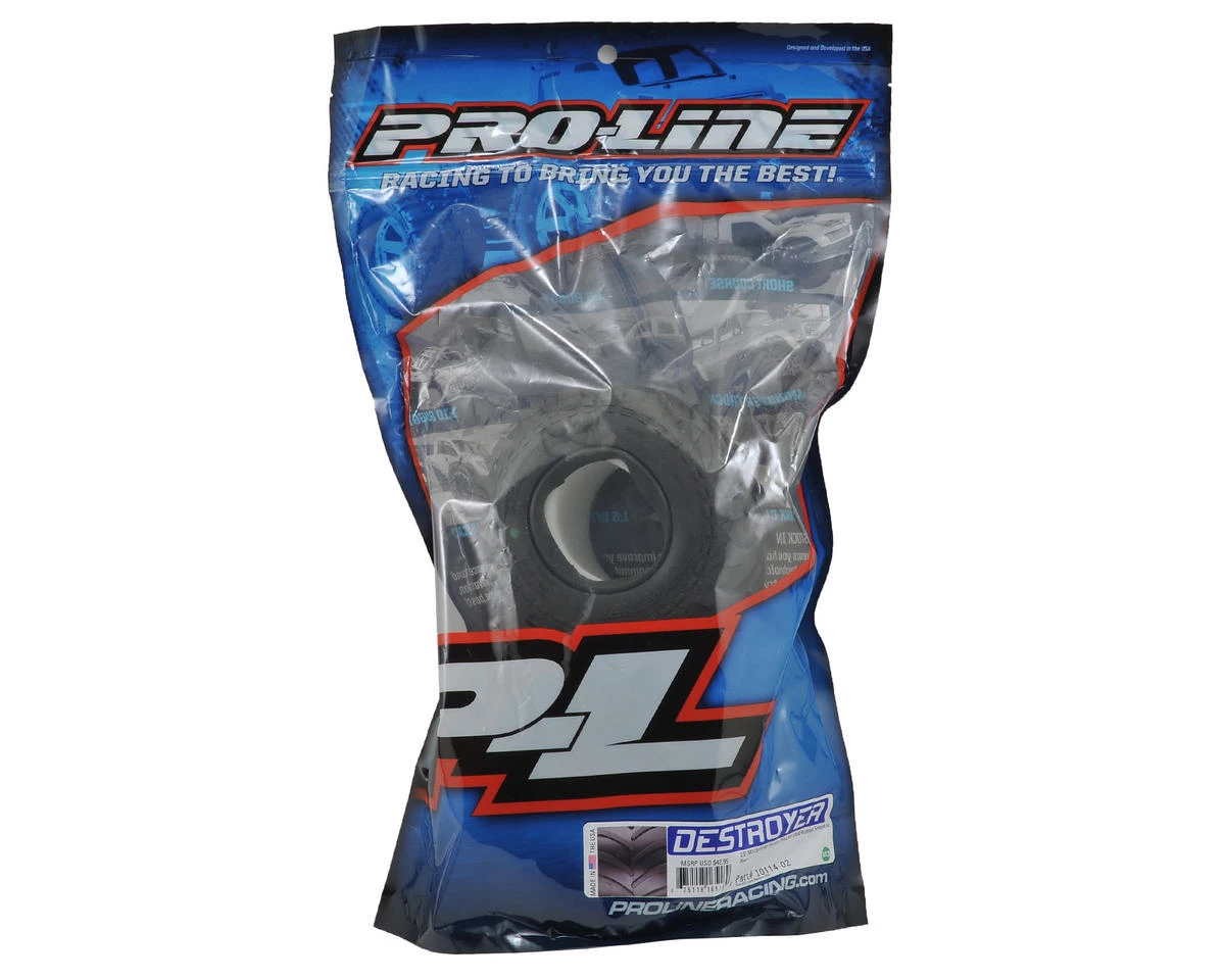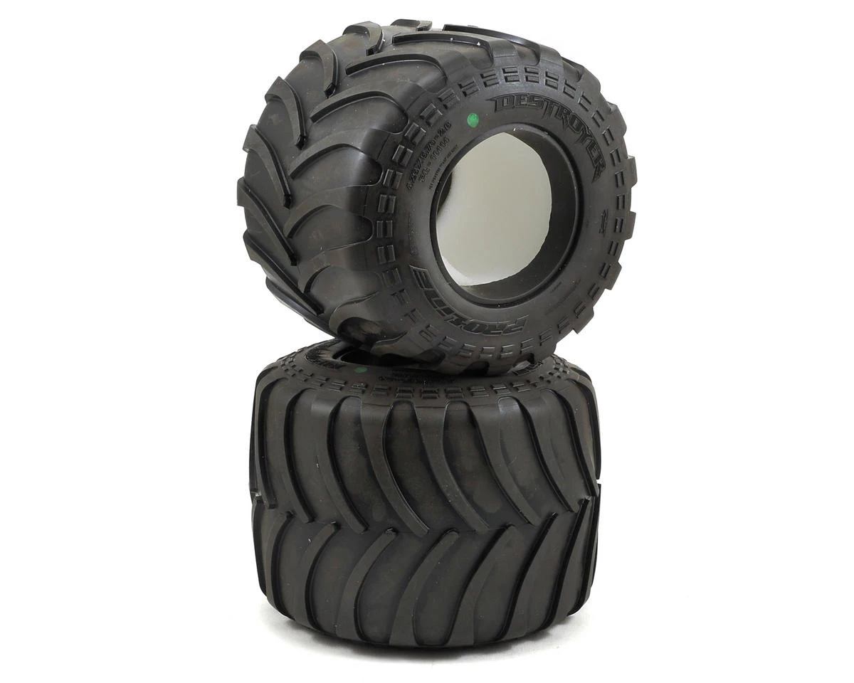 This is a pack of two Pro-Line Destroyer 2.6″ Monster Truck Tires. Pro-Line is proud to introduce an tire specifically designed for Scale Solid Axle Monster Trucks: the Destroyer! The Destroyer is made from Pro-Line’s Legendary M3 Race Rubber for Maximum Destructive Traction on Dirt or Carpet. Similar to full size Monster Truck Tires the Destroyer features an alternating deep-grooved chevron style tread pattern for incredible forward traction while maintaining a scale appearance. The overall size and width of the Destroyer tire has been finely tuned to be lightweight and agile, which makes it ideal for racing applications. The Destroyer includes soft white foam inserts for ultra-plush landings, greatly improving the handling and performance of your Solid Axle Monster Truck.