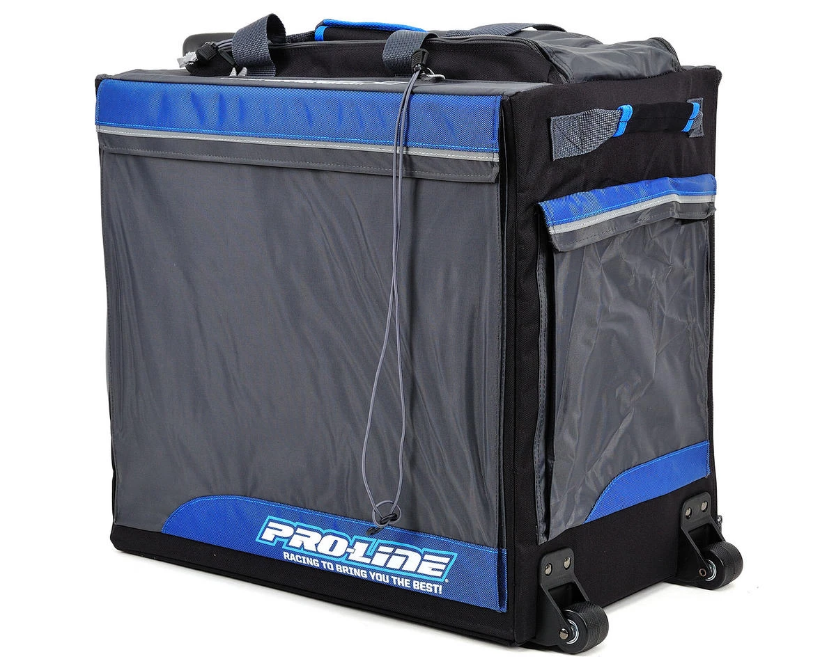 This is the Pro-Line Hauler Bag. Designed with 4 easy access drawer compartments, several zipper pockets and tool storage, the Pro-Line Hauler Bag is perfect for your RC needs. Stylish Pro-Line logos on the front, top and side stand out when arriving at the track and a collapsible pull handle and smooth rolling casters combine to get you organized in the pits. The Hauler Bag also includes tie-down Bungee straps for securing 1 vehicle (Buggy, SC, Truck, etc.) on top of the Bag for fewer trips between the Track and your vehicle.