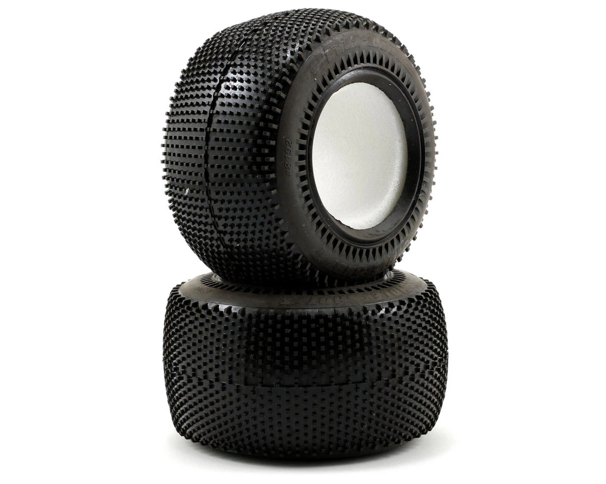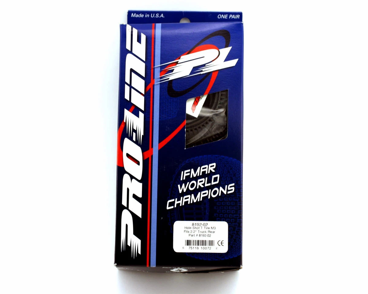 This is a pair of Pro-Line Hole Shot off-road truck tires in M3 compound. The Hole Shot tread is designed for less loamy track conditions. This is a great tire for harder packed tracks, especially tacky clay indoor tracks. The drier the track, the harder the compound of tire you should use (ie: M3 when very wet, M2 when dry). However if the track is very dusty, you should generally use a softer compound tire.