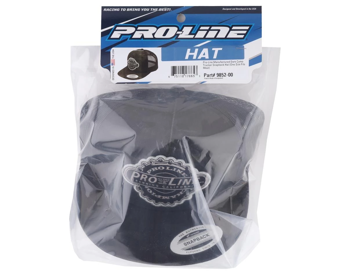 The Proline Manufactured Snapback Hat is a tribute to Pro-Lines manufacturing heritage. Featuring a silhouette of the Champion tire that lead the racing scene in the 80’s and the original anvil logo that was found on early Pro-Line header cards. A dark camo print is used on the front of the hat while the back has an open mesh for the trucker styling. This hat looks great and will be perfect for any occasion. Package includes one snapback hat.