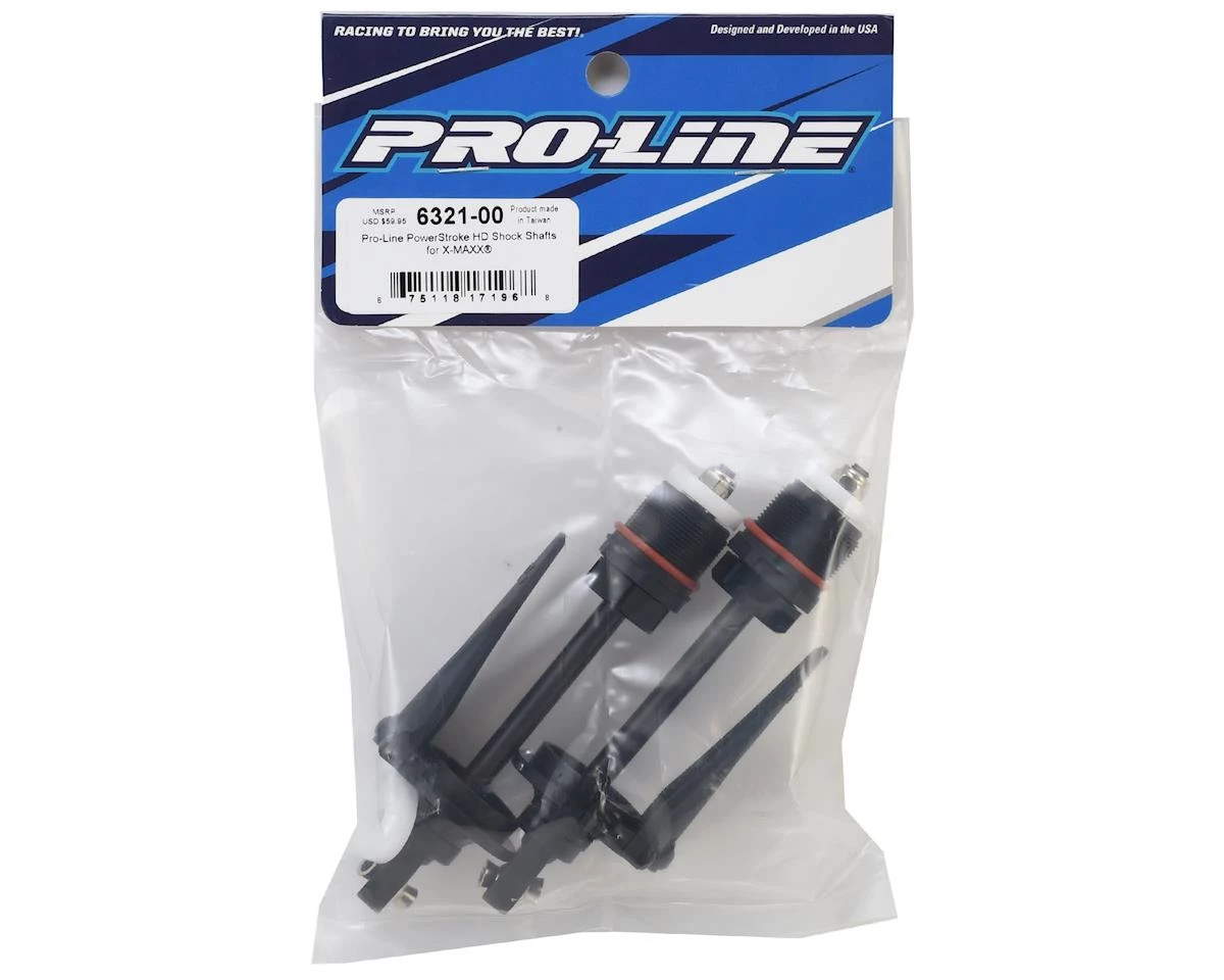 Pro-Line PowerStroke HD Shock Shaft Upgrade features a huge 6.5mm shaft diameter and strengthen the threaded shock ends massively compared to stock. The PowerStroke HD Shaft has been coated with a Titanium Carbon Nitride (TiCN) coating which further hardens the shaft surface and reduces stiction. Integrated Shock Guards protect the Shafts from Rocks, Dirt and Mud and adds style to your truck. The PowerStroke HD Shock Shafts come Pre-Built, so you just need to install and Bash On! The Pistons and Shaft Guides are made from White Delrin for smooth operation and an optional smaller hole piston is included for added tuning options. The larger shaft is made to work with the stock X-MAXX® shock cap, but it also pairs perfectly with Pro-Line’s Ultra Reservoir Shock Caps for even better performance!