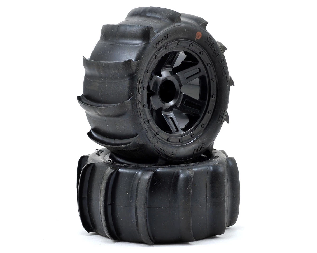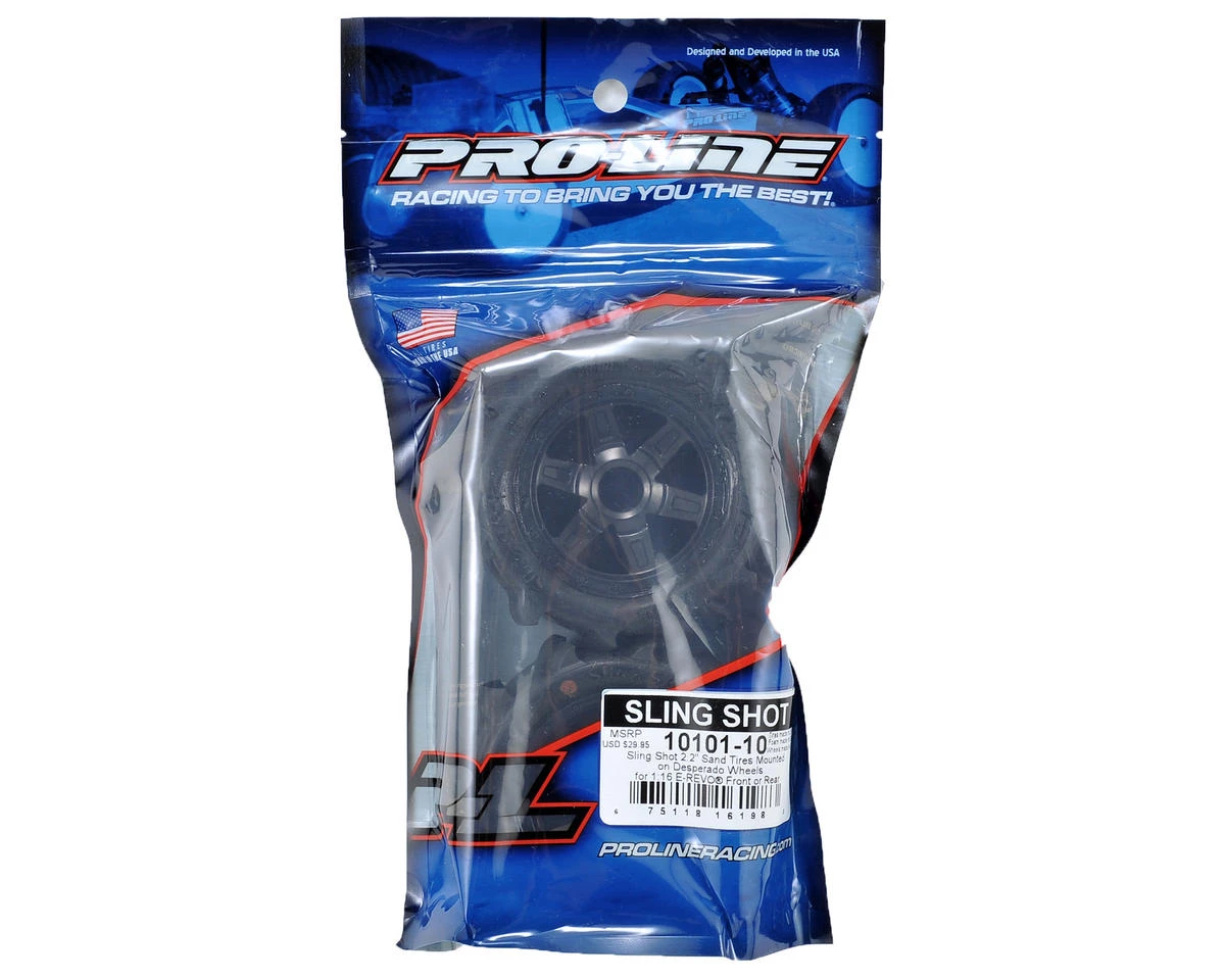 This is a pack of two Pro-Line Sling Shot Tires, Pre-Mounted on Black Desperado Wheels. The Sling Shot provides hours of fun in the sand, snow or even in the occasional mud pit. The 12 paddle design ensures maximum performance due to the true scoop design coupled with low roll outer sidewalls. Plus, Pro-Line makes using high performance, long lasting fun tires easier than ever by offering the Sling Shot tires pre-mounted to the Desperado wheels! The wheel features a wider offset, that will make your truck more stable and handle bumps and jumps like a champion. Pro-Line’s 6-spoke Desperado wheel will make your truck the toughest looking one on the block. The wheel is a one-piece wheel made out of extremely durable nylon material and features a molded in bead-loc ring for an awesome scale look. This is a 12mm hex wheel and it will make your truck stand out from the rest!