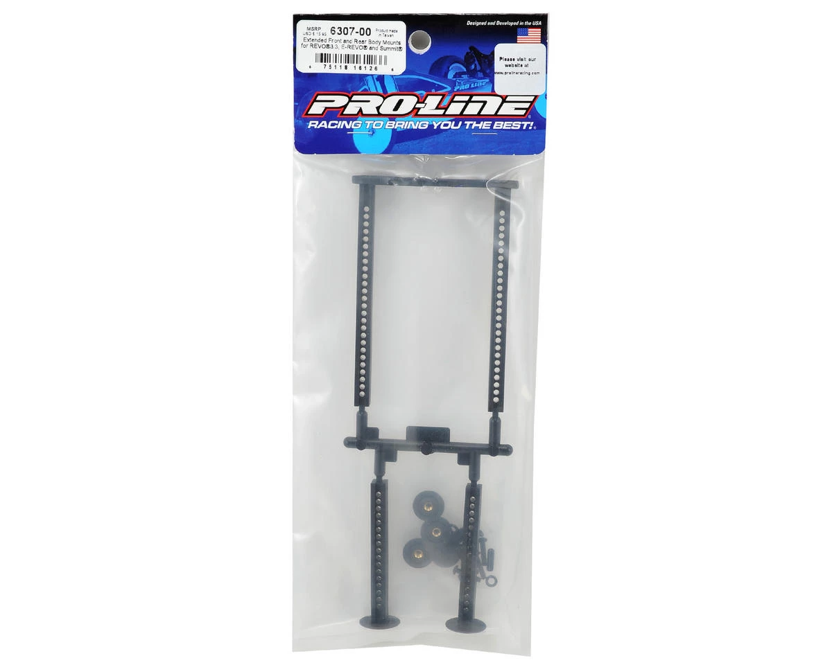 This is an optional Pro-Line Revo/Summit Extended Front & Rear Body Mount set. Pro-Line continues to innovate with more must-have accessories for your Monster Truck. The Pro-Line body mount kit includes adjustable body mounts so you can fit any body on your truck perfectly! But, the Pro-Line Engineers did not stop there. Instead of just using the same old flimsy body clips that always get lost and bent, the Pro-Line Extended Body Mount kit includes a revolutionary screw on body mounting system for a strong and secure mount every time. Just screw down the included setscrew into the body mount, place the O-Ring over the setscrew and mount your body as you normally would. This Extended Body mount kit adds safety, security and styling not available with the stock mounts.